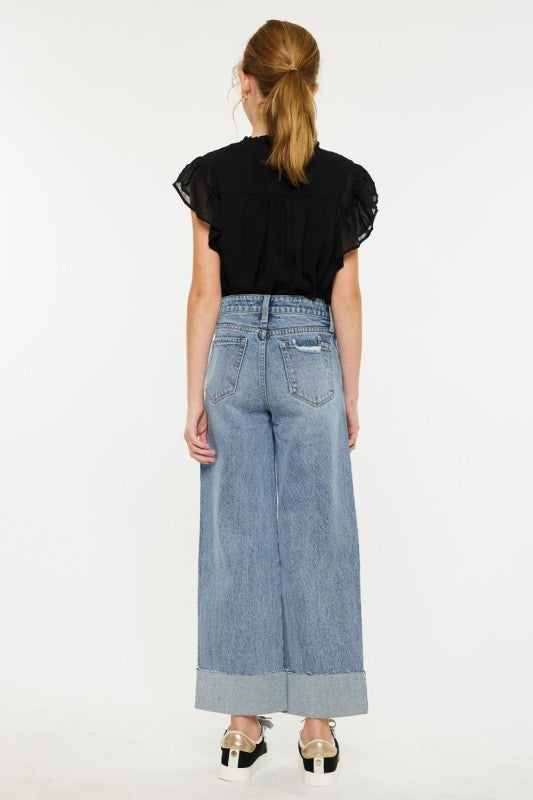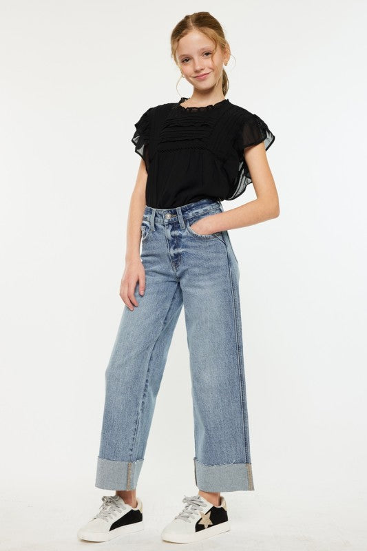 MEDIUM WASH COMFORT STRETCH 5 POCKET STYLE 3" CUFFED HEM ZIPPER FLY RISE 9.5" INSEAM 23.5"(CUFFED) IN SIZE 10 99% COTTON, 1% SPANDEX