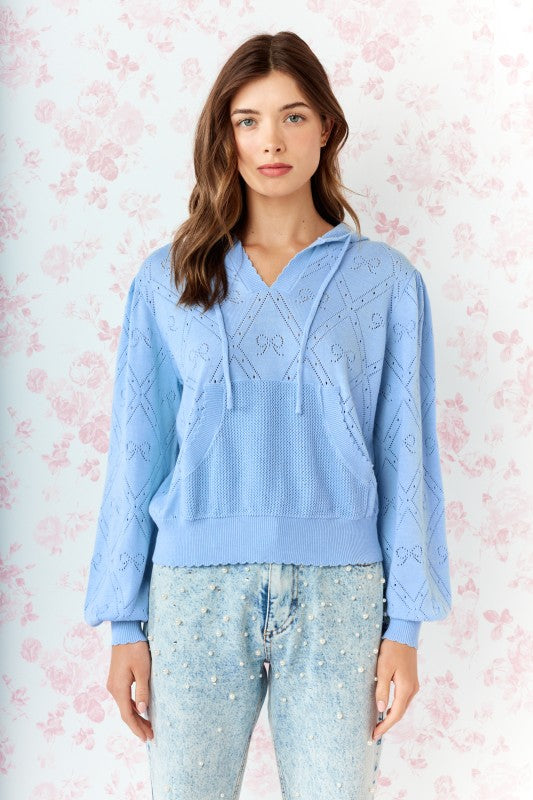 - Regular fit - Hip length - Lightweight and breathable knit - All-over bow pointelle knit pattern - Kangaroo pocket with scalloped trim - Puff sleeves with ribbed cuffs - Scalloped V-neckline with hoodie