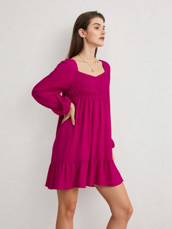 Bust Pleated Long Sleeve Mini Dress - Magenta