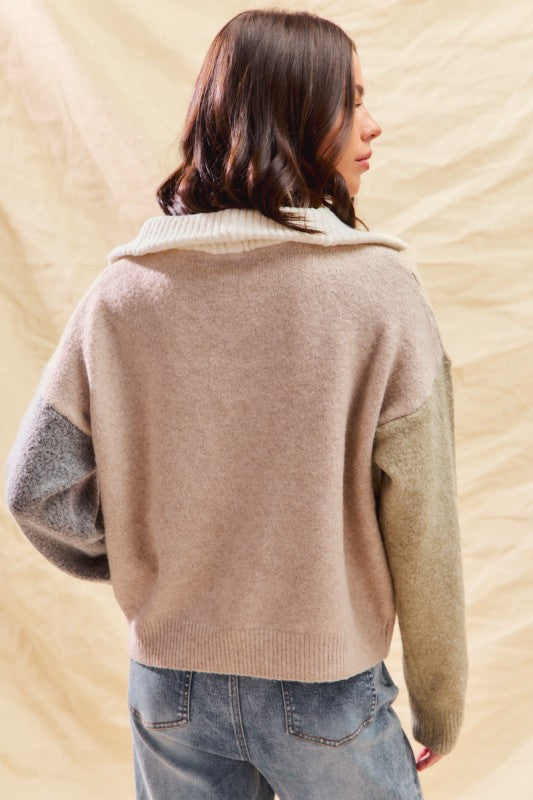 Colorblock Zip Up Cozy Sweater - Oat Sage Grey