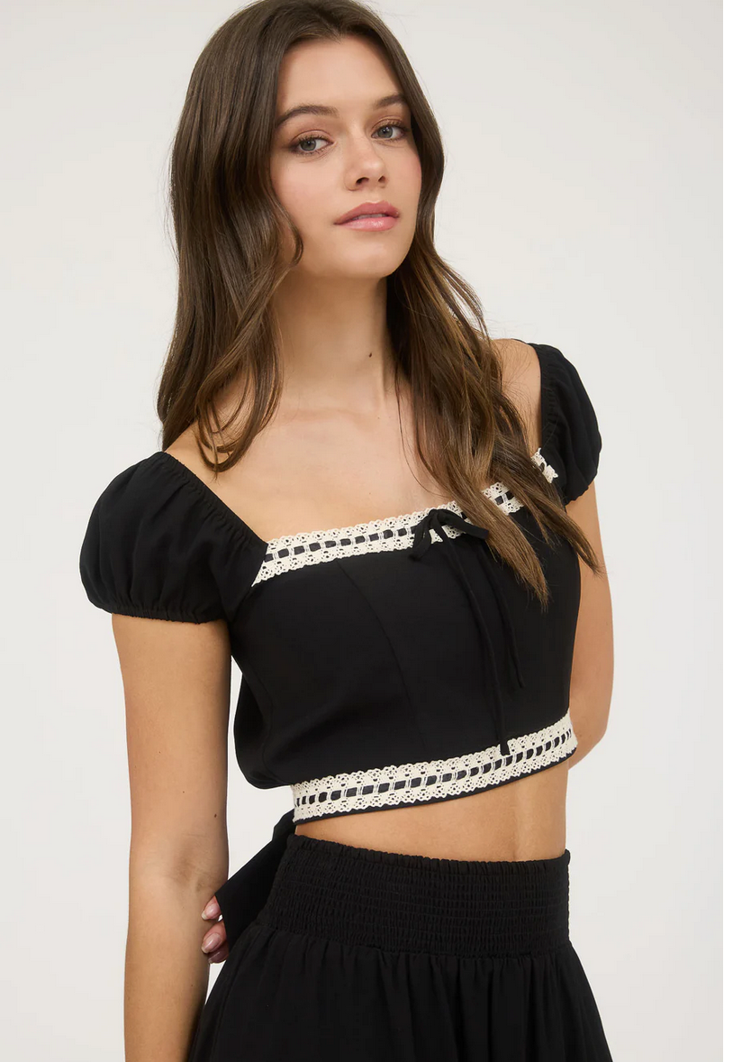 SQUARE NECKLINE SHORT ELASTIC SLEEVES BACK TIE DETAIL LACE TRIM WITH RIBBON DETAIL FRONT TIE DETAIL CROP TOP CONTRAST LINED SHELL: 100% POLYESTER LINING: 100% POLYESTER EXCLUSIVE OF DECORATION
