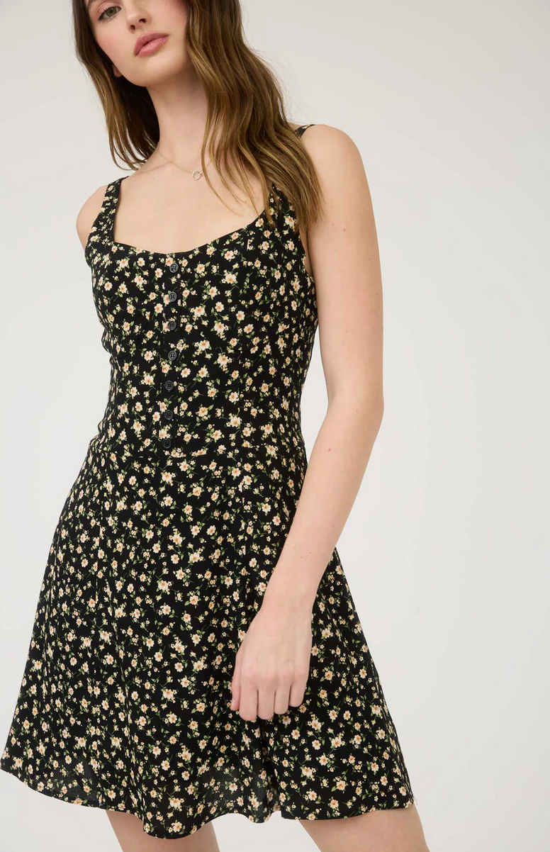 SCOOP NECKLINE SLEEVELESS BACK ZIPPER BACK ELASTIC TUNNEL DETAIL HALF BUTTON DOWN FUNCTIONAL BUTTONS LINED FLORAL PATTERN MINI DRESS SHELL: 100% RAYON LINING: 100% POLYESTER