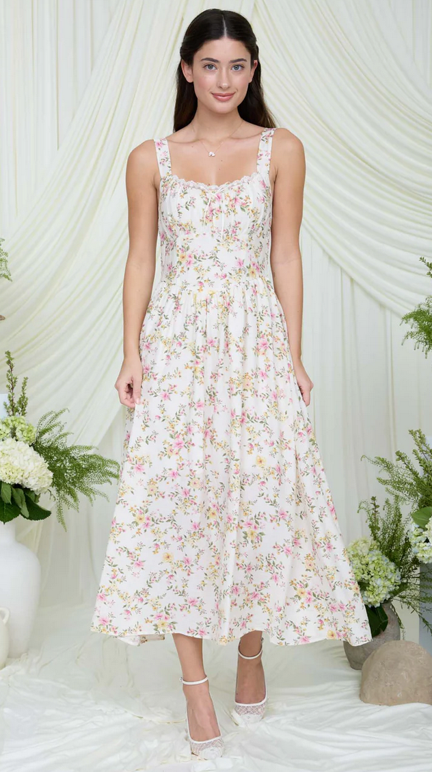 SCOOP NECKLINE LACE TRIM DETAIL SLEEVELESS ADJUSTABLE STRAP DETAIL BACK SMOCKING A-LINE CORSET DETAIL FLORAL PATTERN LINED MIDI DRESS SHELL:80%RAYON 20%NYLON CONTRAST:100%POLYESTER LINING:100%POLYESTER EXCLUSIVE OF DECORATION