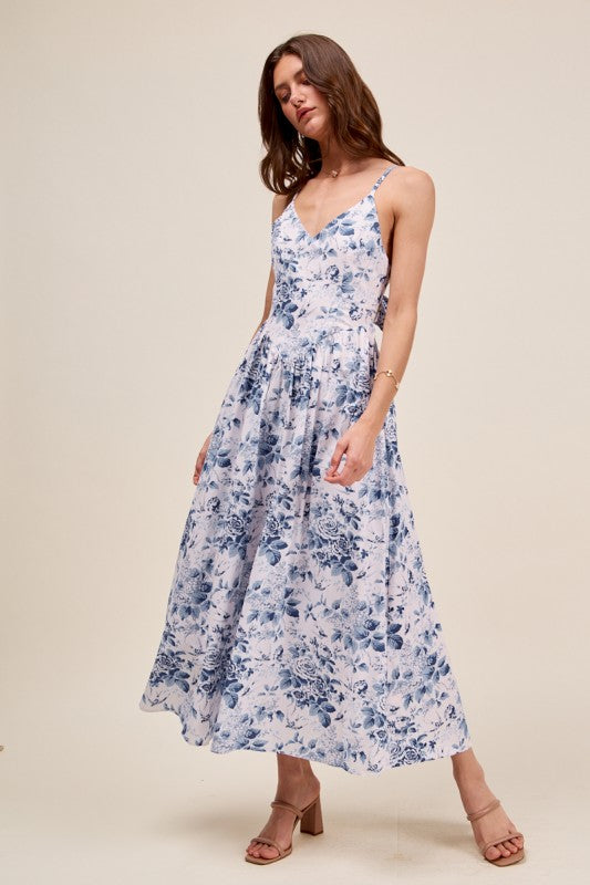 Floral Lined Dress BackBow Ribbon Tie - Bue