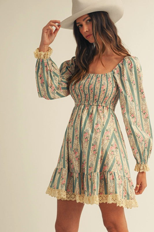 -FRNCH STYLE FLORAL SMOCKED LACE DETAIL MINI DRESS -FEATURES SMOCKED DETAILING ON THE BODICE FOR A FITTED -SOFT PASTEL HUES