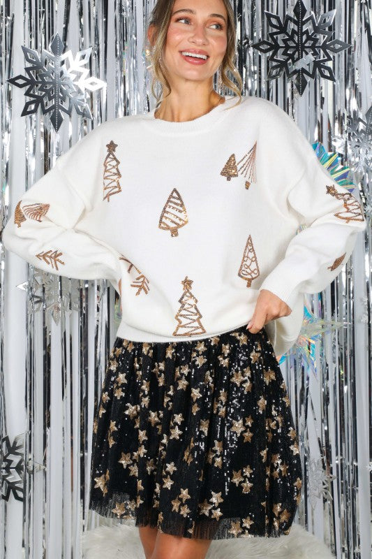Gold Tree Sequin Accent Sweater - Cream