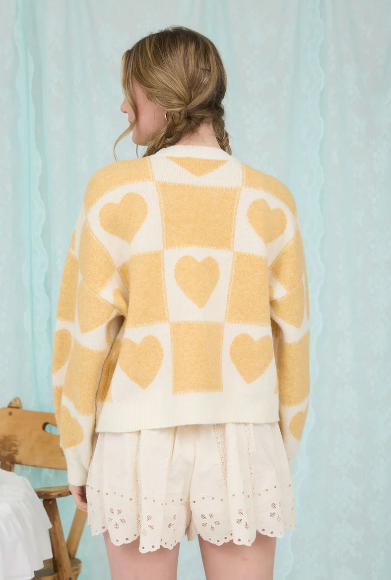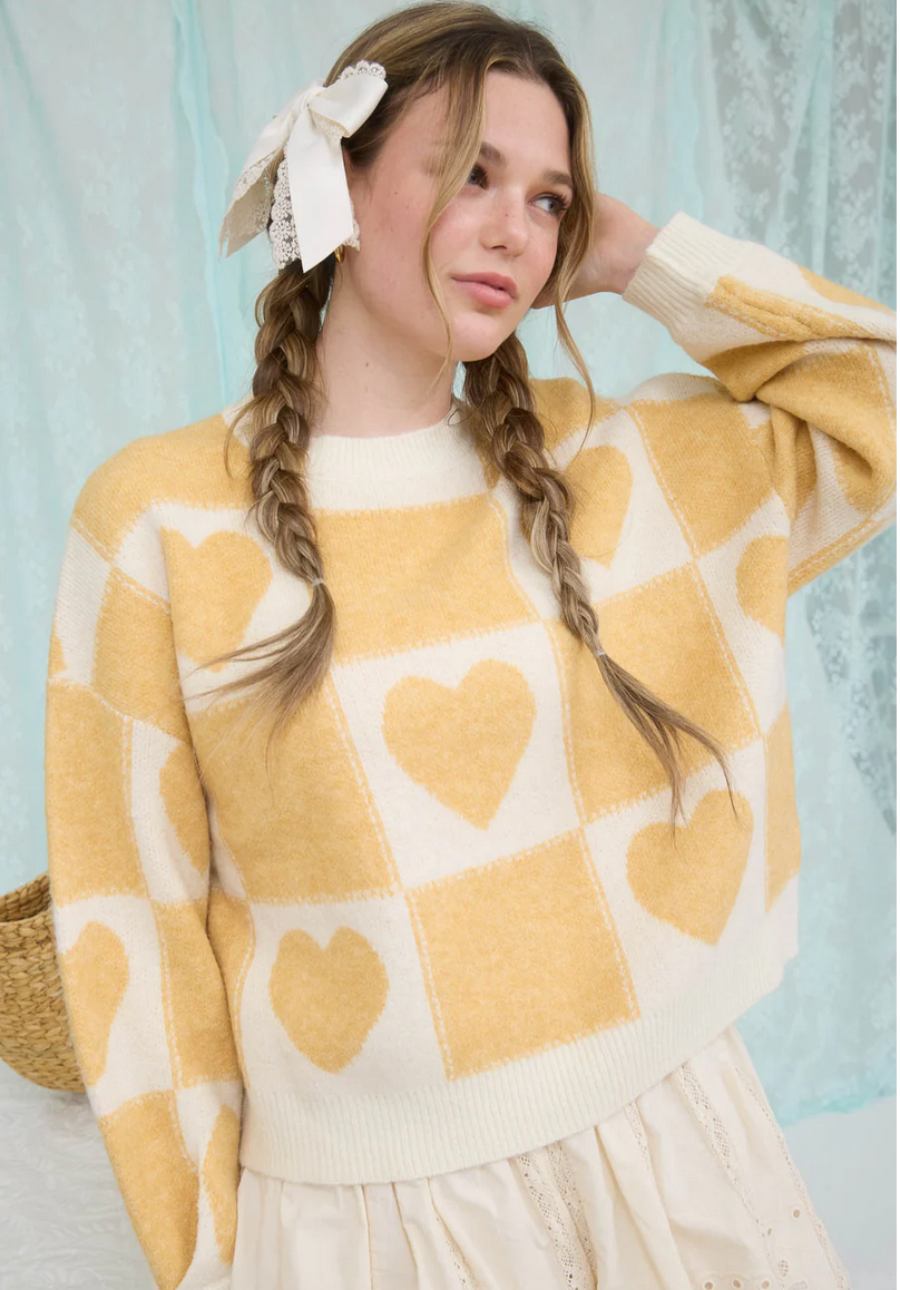 CREW NECK LONG SLEEVES DROP SHOULDER RELAXED FIT HEART CHECKERED PATTERN KNIT PULLOVER SWEATER 74%ACRYLIC 22%POLYESTER 4%SPANDEX