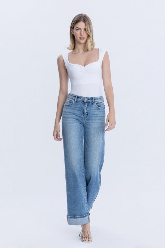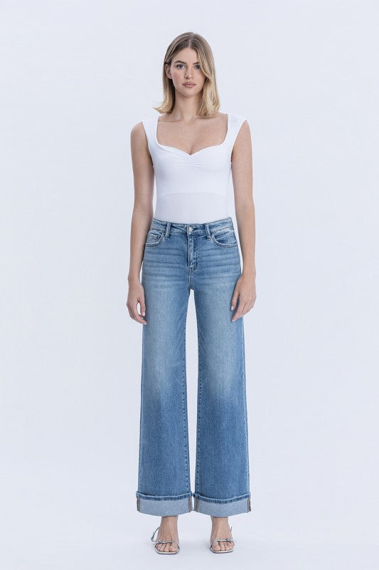 WASH, WIDE JEANS F. RISE: 10 1/2" / INSEAM: 32" / LEG OPENING: 20" / CUFF: 3" X 1 MODEL IS 5'10" WEARING A SIZE 26