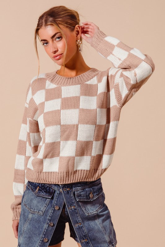 Loose FIt Checkered Knit Sweater - Taupe/Ivory