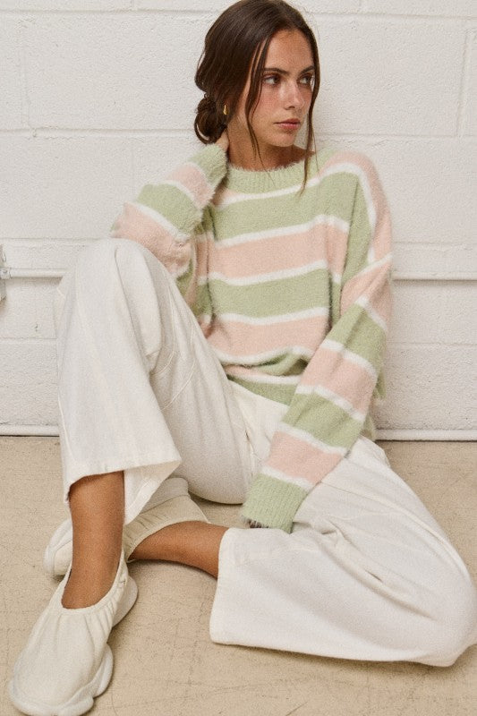 Loose Fuzzy Knit Sweater - Sage/Blush
