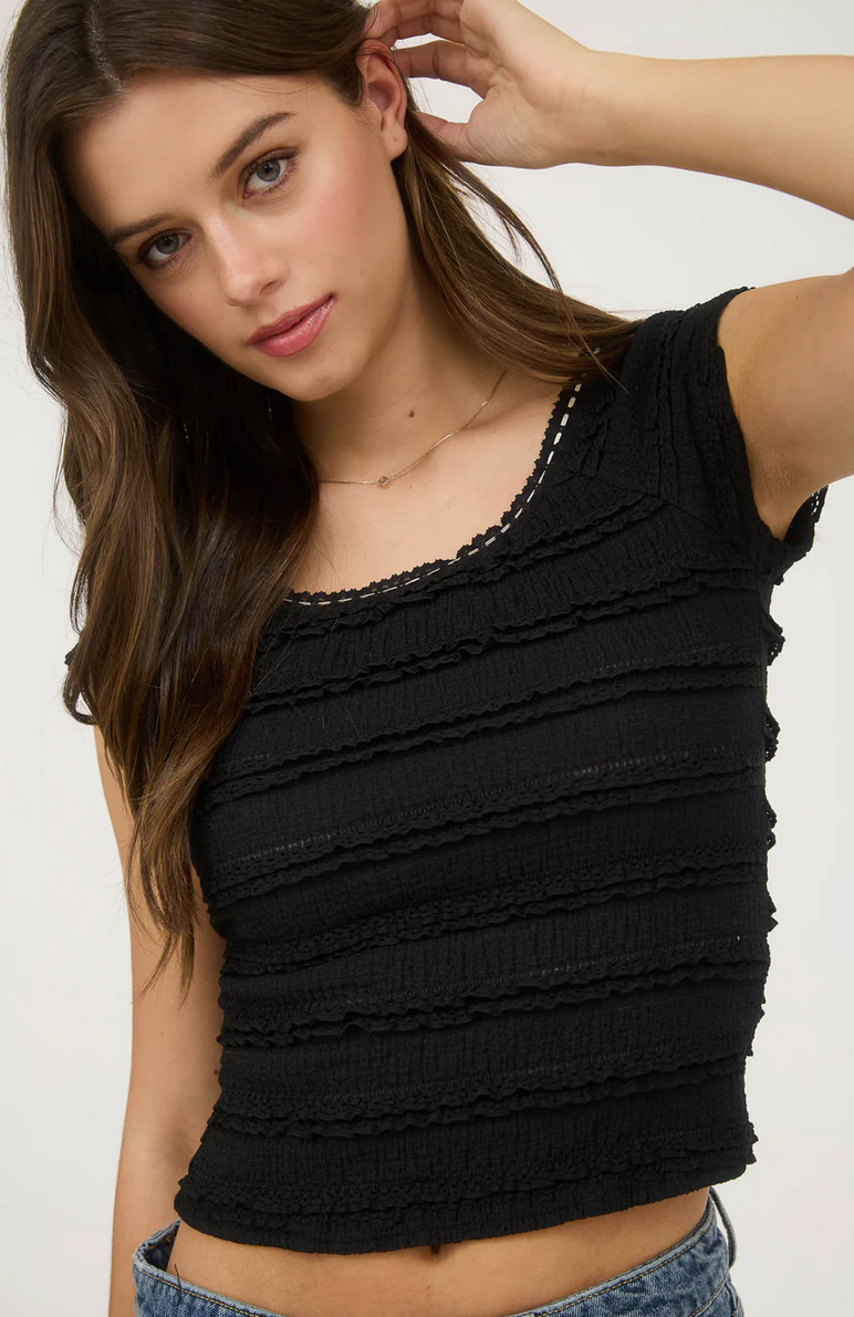 SCOOP NECKLINE SHORT SLEEVES CROPPED RUFFLE LACE TEXTURED PATTERN SOLID NOT LINED KNIT TOP 97%POLYESTER 3%SPANDEX EXCLUSIVE OF DECORATION