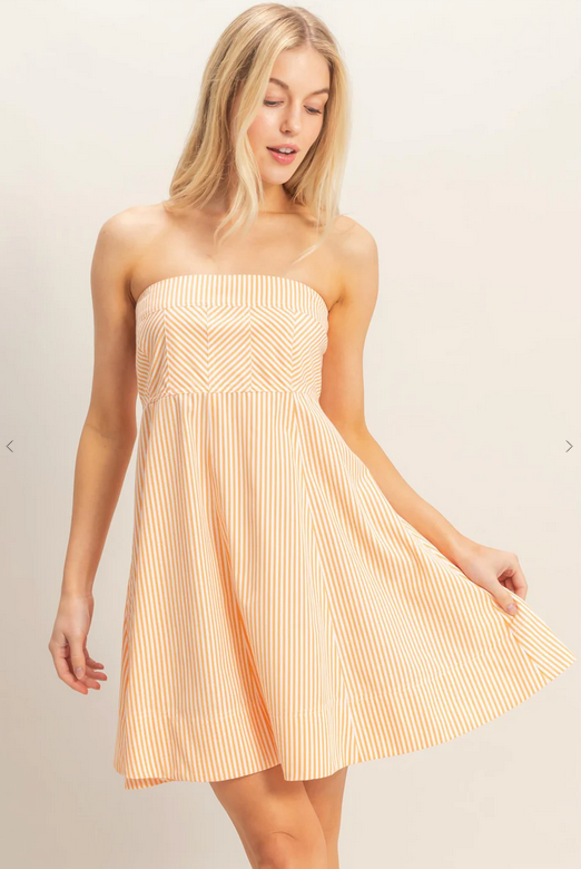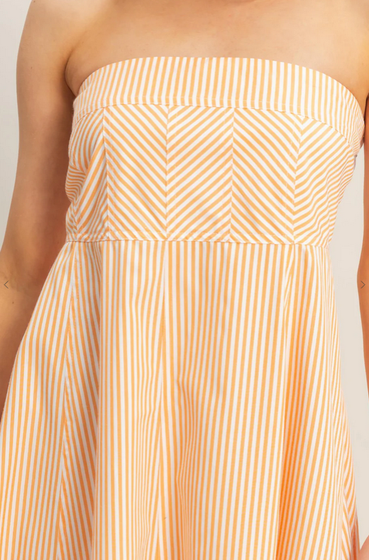 This strapless A-line dress features a subtle striped pattern and a smocked bodice that enhances the silhouette. The invisible zipper side closure ensures a smooth fit, while the boning provides extra support. Pair it with a wide-brimmed hat for an elegant, summery ensemble.