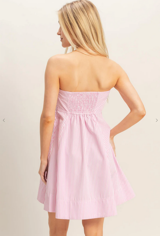 This strapless A-line dress features a subtle striped pattern and a smocked bodice that enhances the silhouette. The invisible zipper side closure ensures a smooth fit, while the boning provides extra support. Pair it with a wide-brimmed hat for an elegant, summery ensemble.